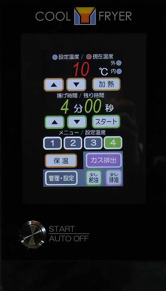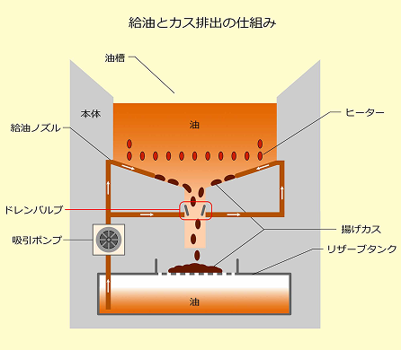 揚げ物が増えると油の中に揚げカスが溜まり、油を劣化させてしまいます。しかし油槽内の揚げカスを取り除くには一度排油してお掃除、給油といった作業になり、営業時間内に行うのは難しいのが実情です。揚げカス自動排出機構を持つCFT-18xはボタン一つで揚げカスを自動排出し、揚げカス排出で減った油槽内の油を自動で補充します。これにより営業時間内でも調理を止めることなく揚げカスを排出することが出来、油の劣化を抑えます。