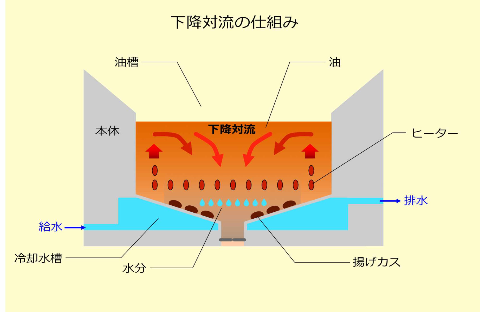 CFT-18xはクールフライヤーテクノロジーにより油槽内の油に下降対流を発生させます。これにより調理中に発生した水分を油槽下部に落とし込んで油ハネを抑え、オイルミストの発生も減らします。また揚げカスも油槽下部に落とし込むため、油の劣化も防ぎます。