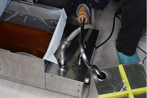 ろ過機は油をろ過するだけではありません。ろ過機を使ってフライヤーの油槽をお掃除することが出来ます。油槽の汚れは油汚れなので「油の汚れは油で落とす」のが最適。汚れを洗い落とした油は、ろ過機のフィルターを通して汚れを取り除くことが出来るので油を再利用出来ます。